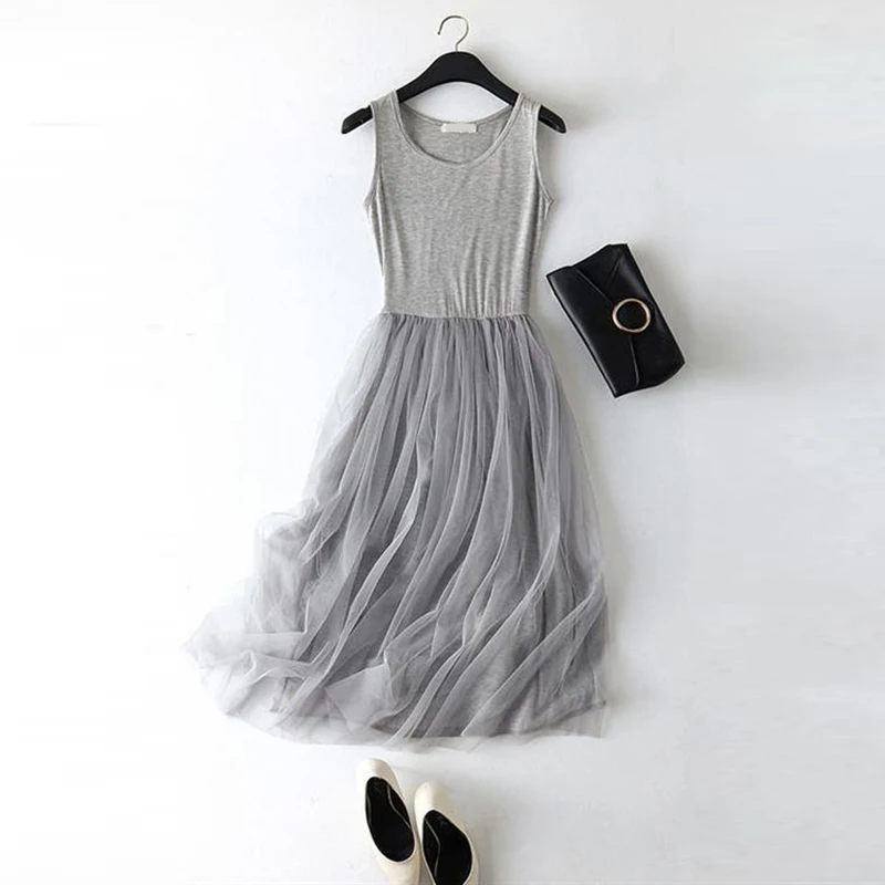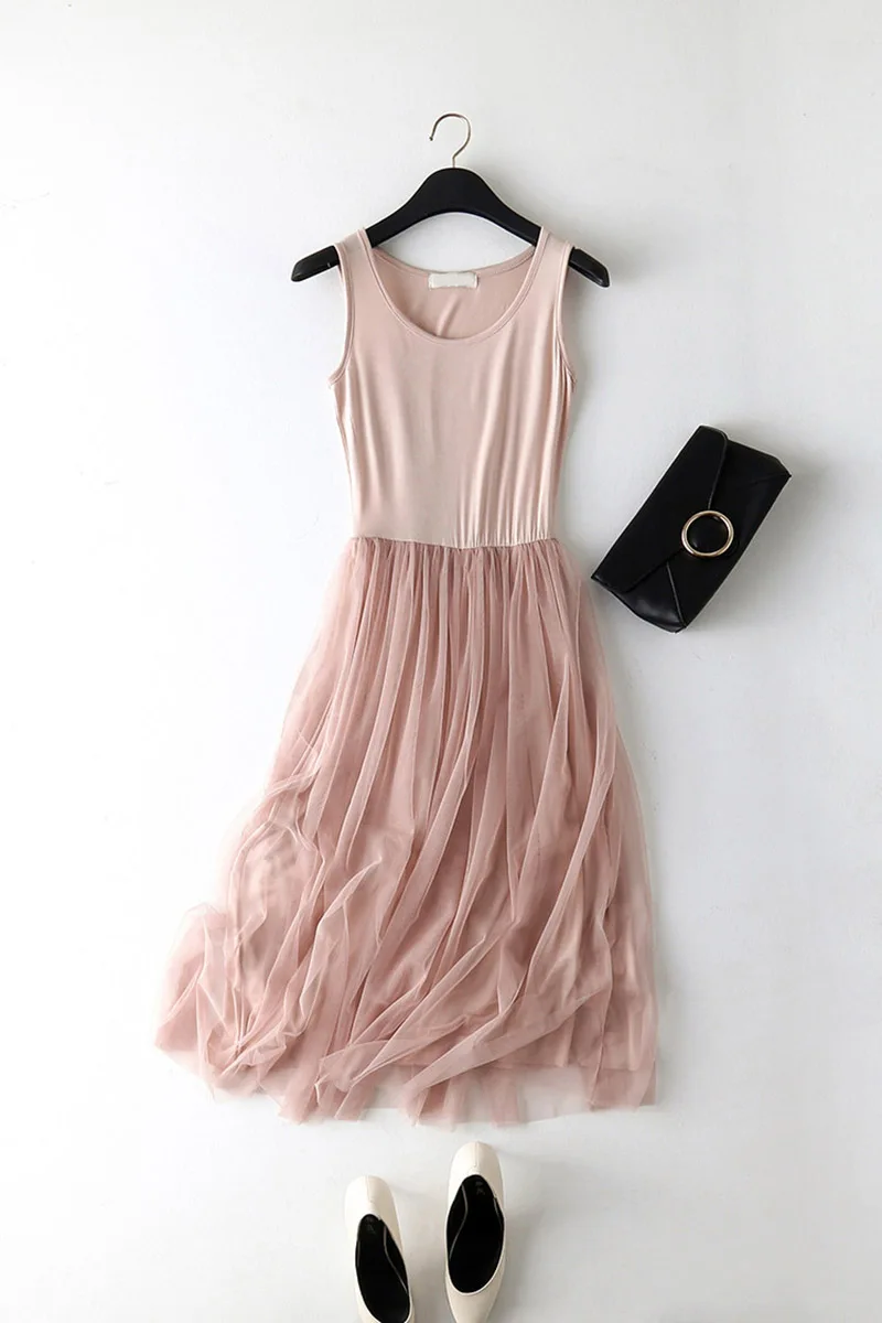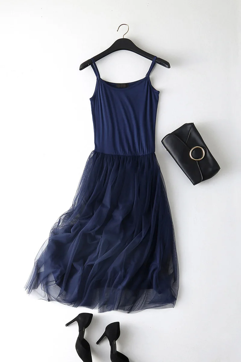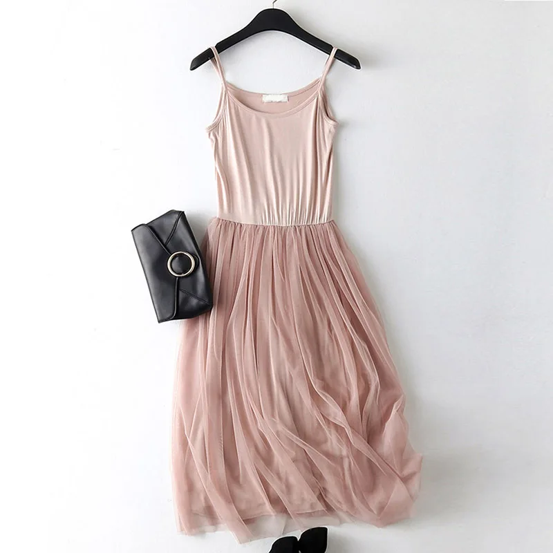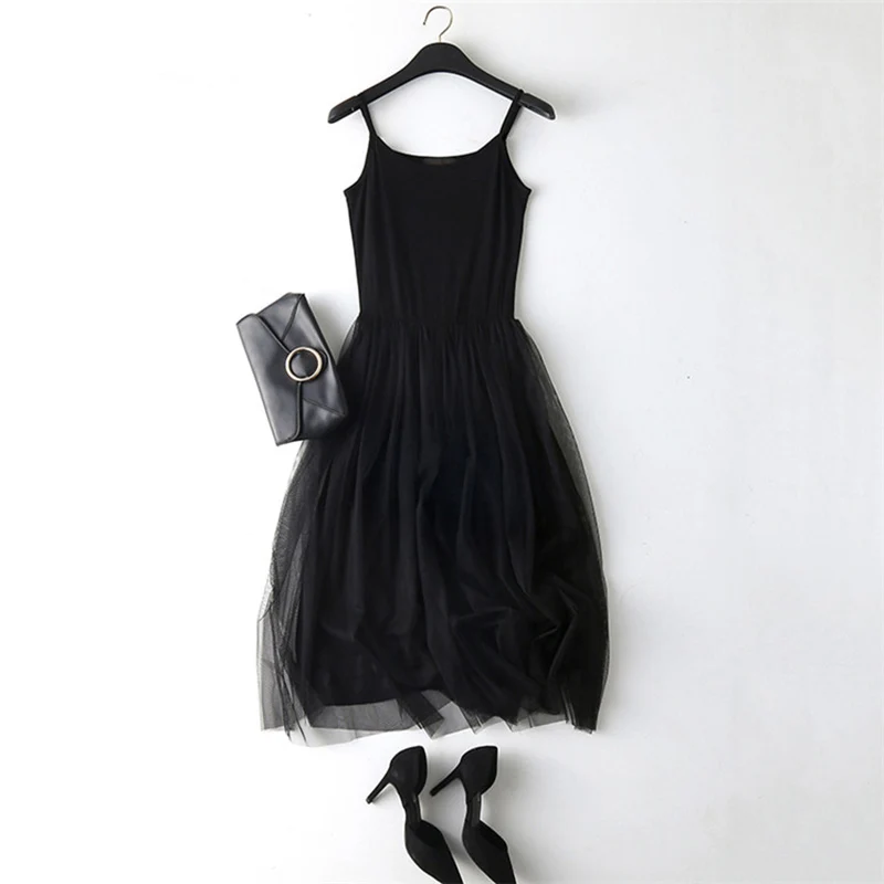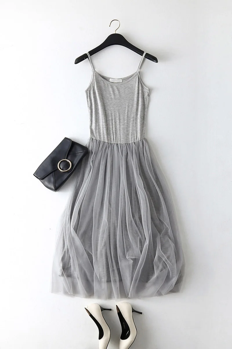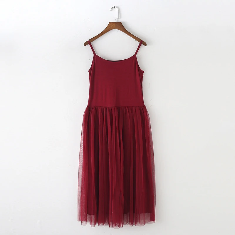 spaghetti strap patchwork mesh dress: casual gauze long dress