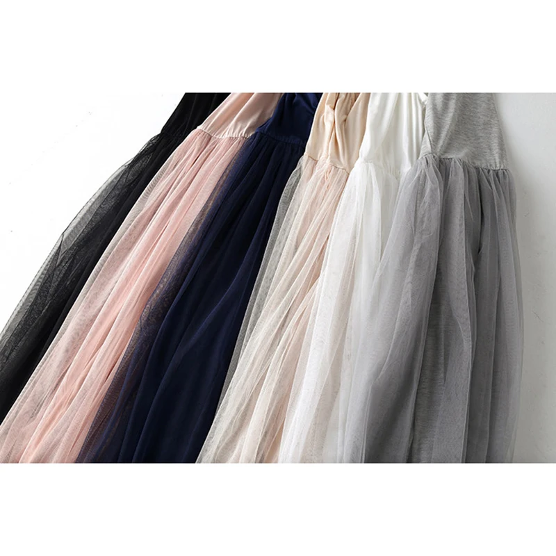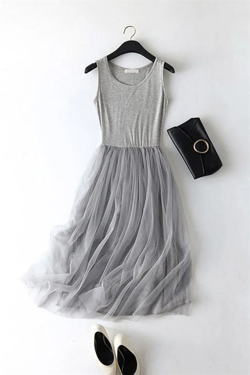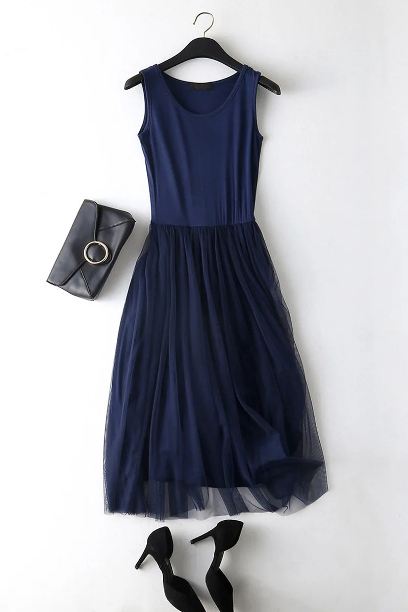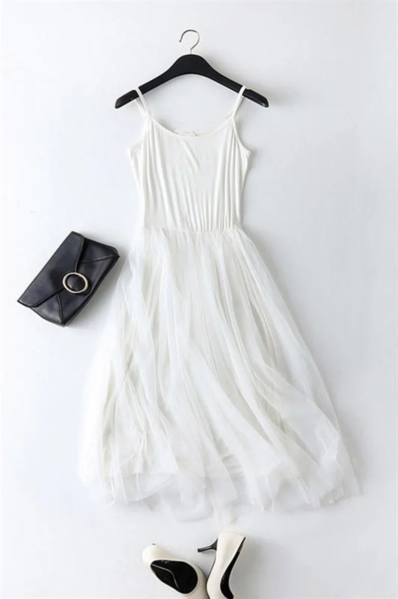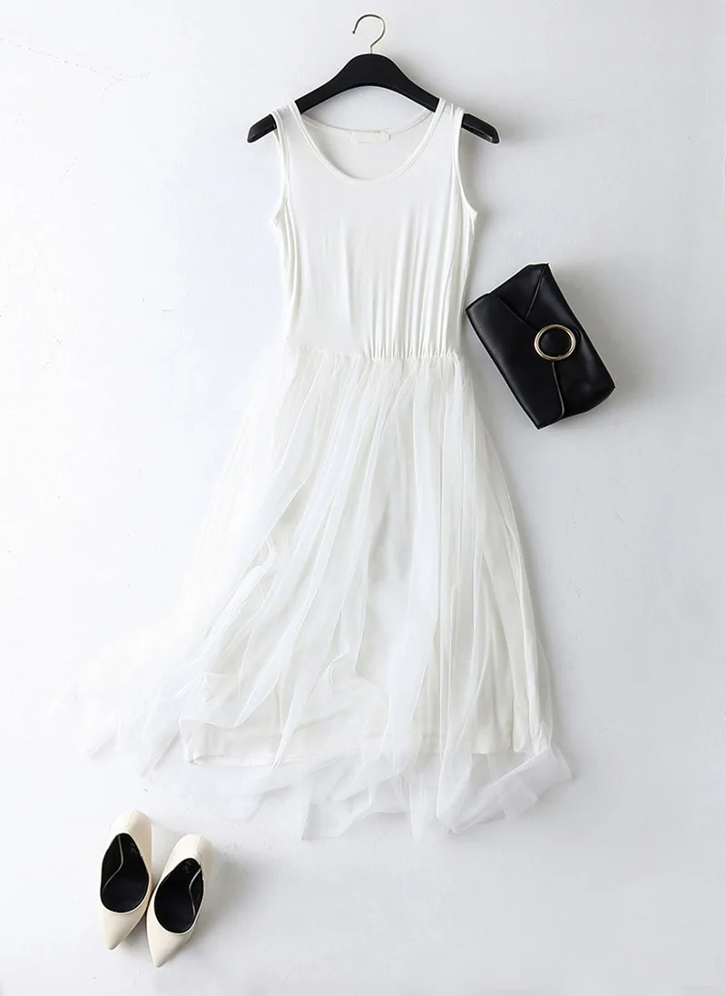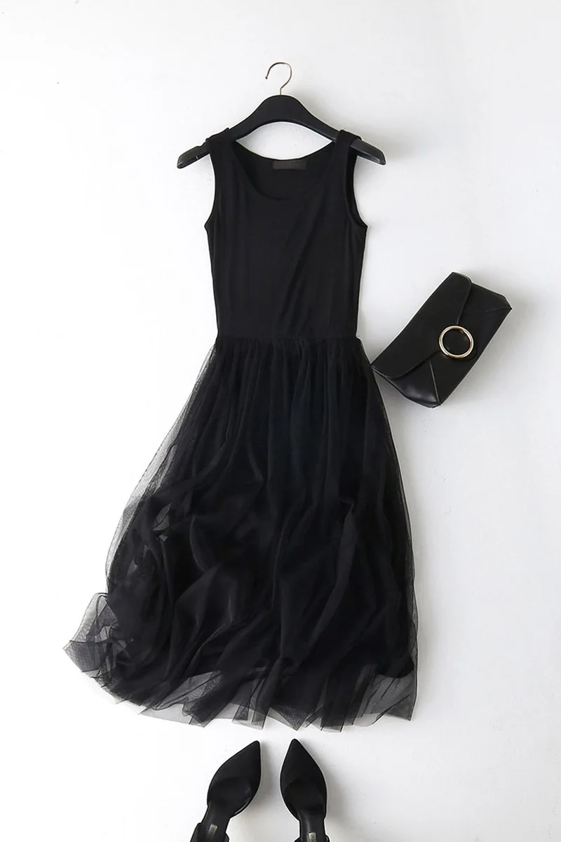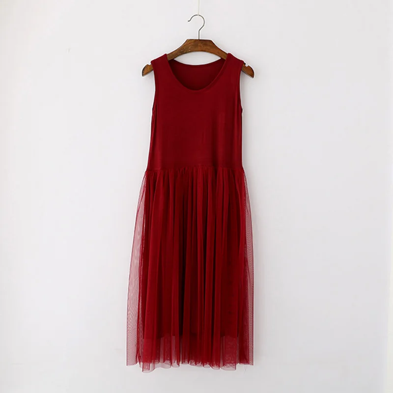 spaghetti strap patchwork mesh dress: casual gauze long dress