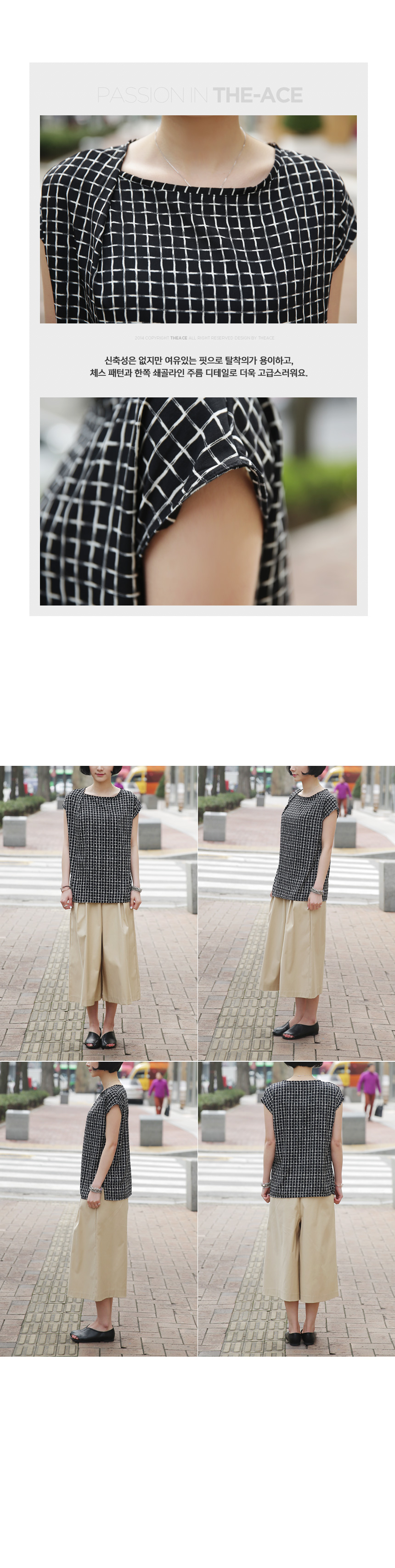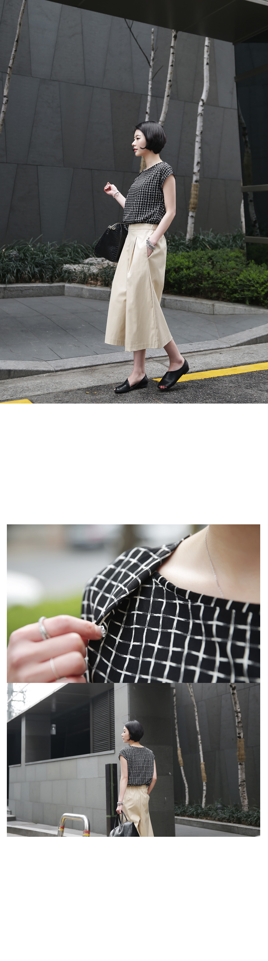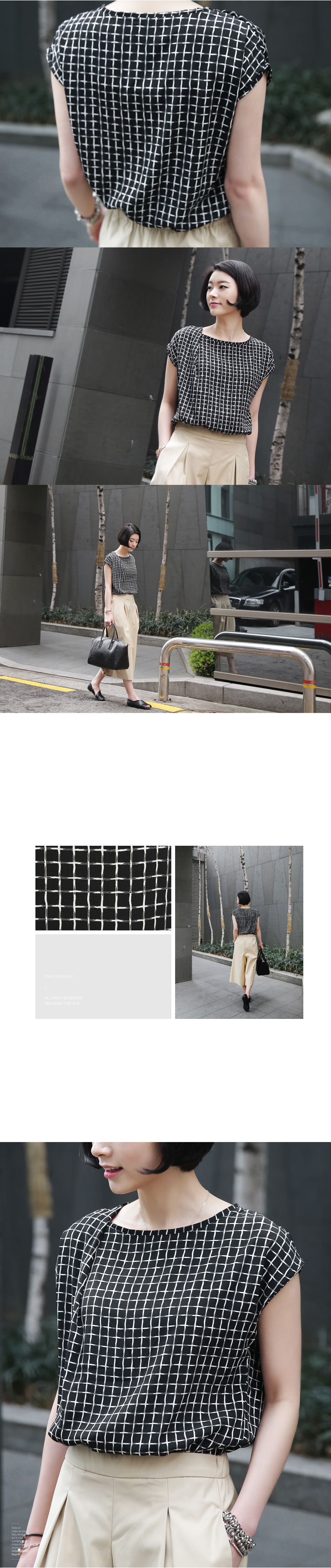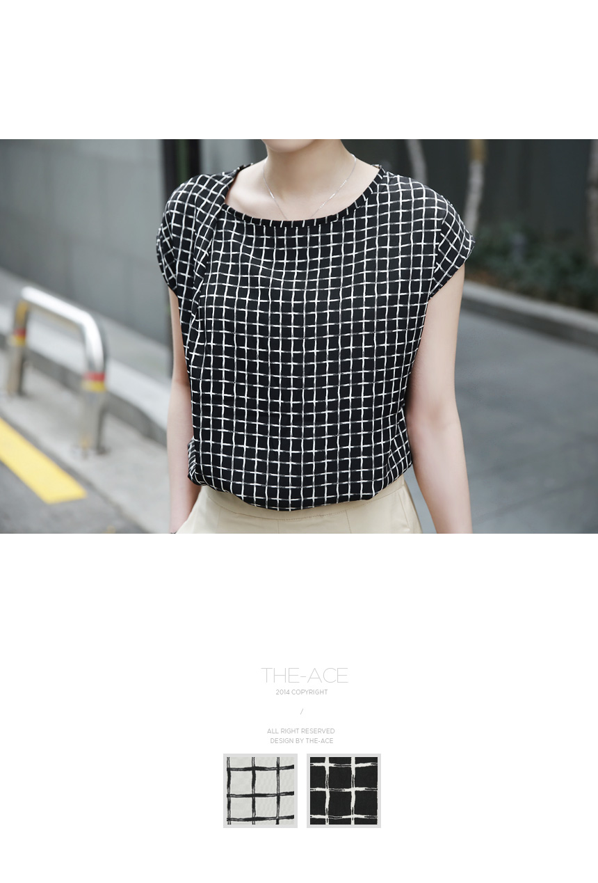 1. 차르르 떨어지는 부드러운 촉감과 배색의 체스 무늬로 화려하면서도 품격있는 민소매 블라우스.