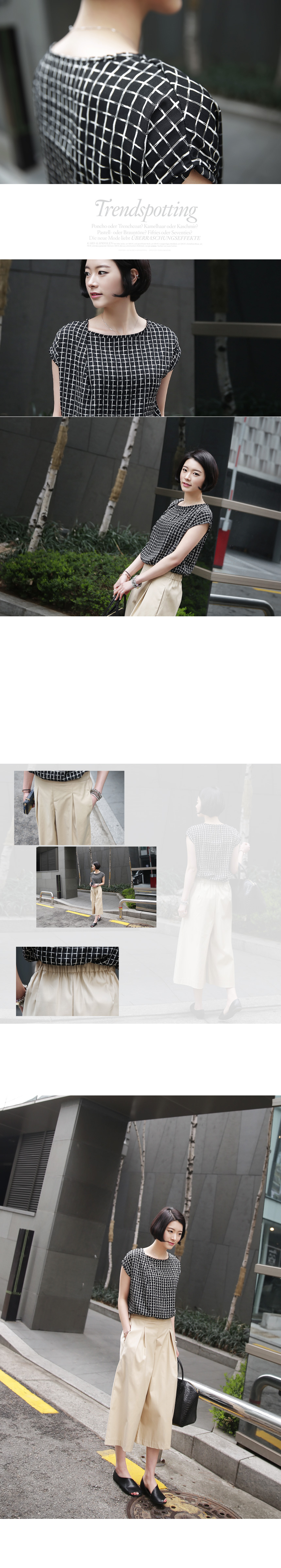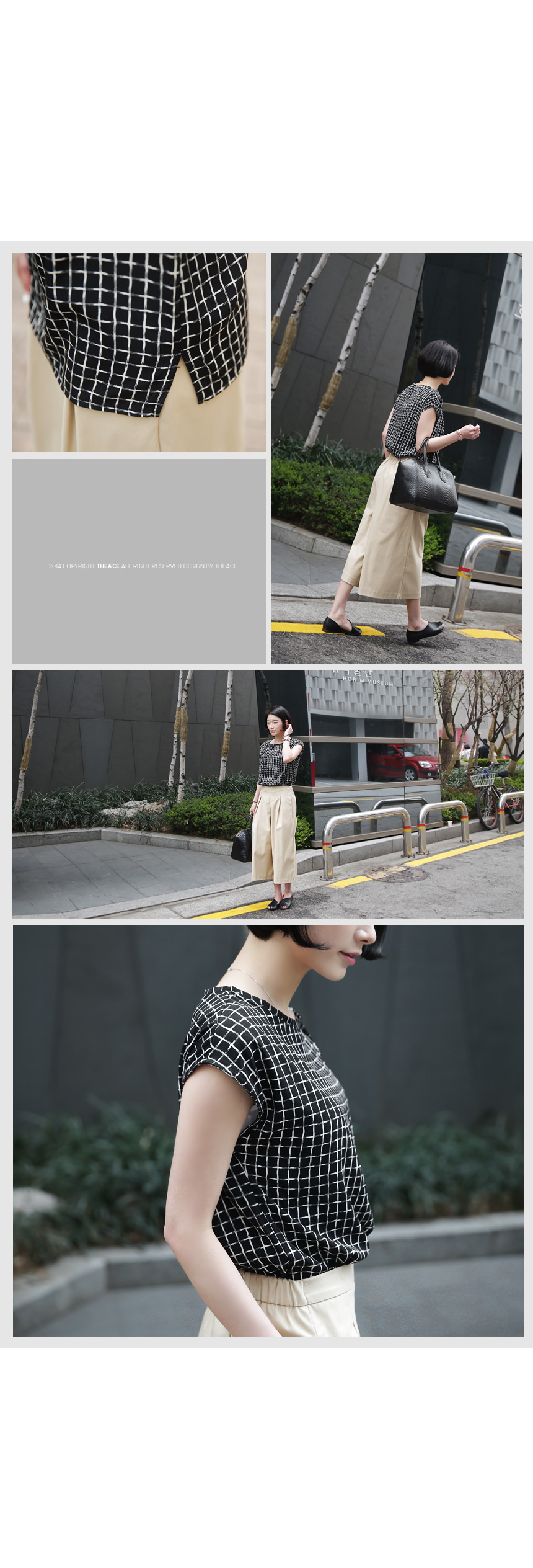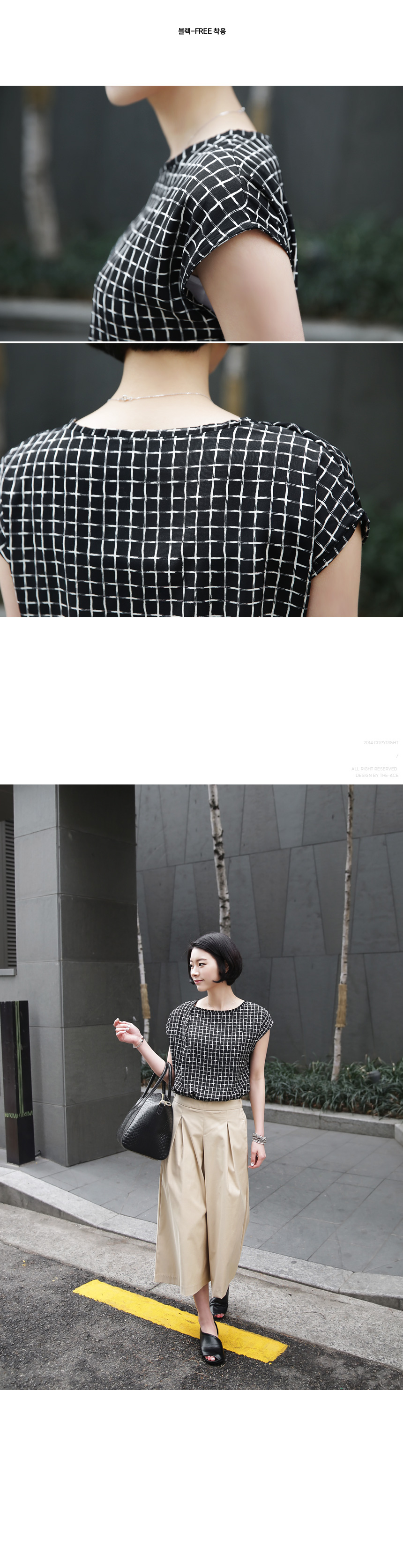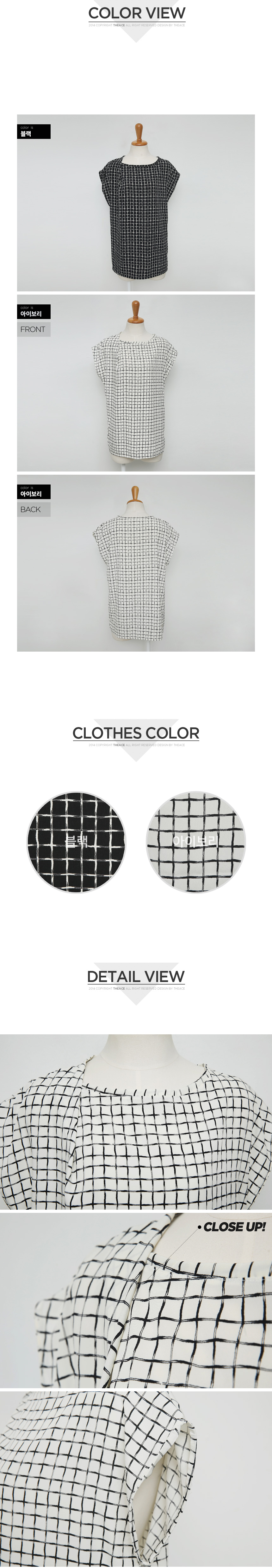 1. 차르르 떨어지는 부드러운 촉감과 배색의 체스 무늬로 화려하면서도 품격있는 민소매 블라우스.