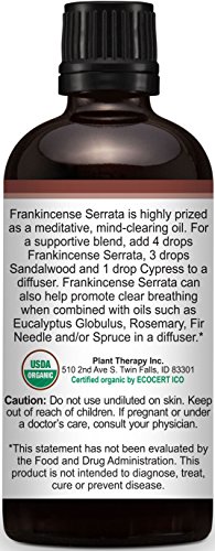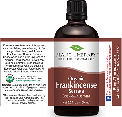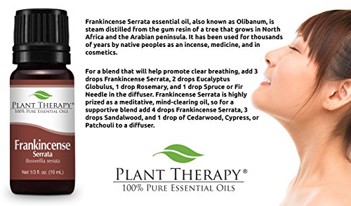 Studio : Plant Therapy Publisher : Plant Therapy Binding : Health and Beauty Product Description This prized woody, earthy meditative oil, also known as Olibanum, has been used as a ceremonial incense and in medicine for thousands of years. The 100% pure essential oil is steam distilled from the gum resin of a tree that grows in North Africa and the Arabian peninsula. Yoga practitioners use mind-clearing Organic Frankincense Serrata essential oil to uplift and support balanced moods. It is also known for its ability to keep skin smooth and young-looking. Whether diffused or diluted with a carrier oil and applied topically, Organic Frankincense Serrata is a wonderful addition to any essential oil collection. It blends well with Bergamot, Carrot Seed, Cedarwood Atlas, Clove, Lemon, Myrrh, Nutmeg, Orange, Pine, Sandalwood, Spruce and Vetiver. Diffuse 3 drops Organic Frankincense Serrata, 2 drops Eucalyptus Globulus, 1 drop Rosemary and 1 drop Spruce or Fir Needle for a blend that promotes clear breathing. 0