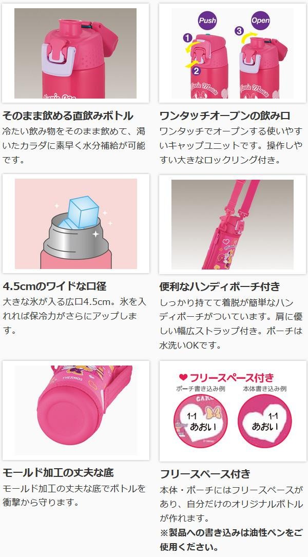 | 小さなお子様でも使いやすいワンタッチオープンの保冷専用ボトルです。4.5cmのワイドな口径で、氷を入れれば保冷力がさらにアップ。ハンディポーチは水で丸洗いできるから汚れもさっと落とせます。国内では商品が少ないアメリカ本国監修のグラフィックです。楽しいテーマパークのデザインで水分補給をもっと楽しく♪ |