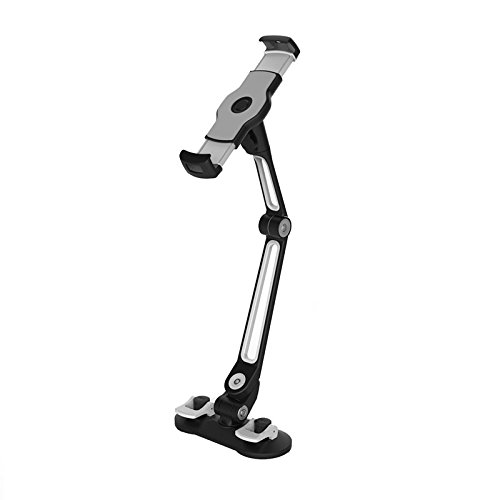 Premium aluminum foldable frame for durability and easy portability; Strong 2 suction cup bases for secure fit to any surface (textured or flat); The heavy duty tablet stand has 2.2 lbs maximum load capacity