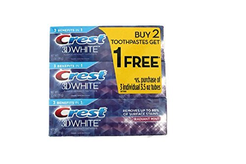 -. Binding : Health and Beauty -. Brand : Crest -. EAN : 0037000703037 -. Feature : Whitens teeth by removing up to 80 percent of surface stains. / Protects teeth against future stains / Strengthens teeth and safe on tooth enamel / Fluoride toothpaste protects against cavities. / Radiant mint flavor in convenient 3 Pack -. IsAdultProduct : 0 -. Label : Procter and Gamble -. Manufacturer : Procter and Gamble -. Model : 3D -. MPN : 3D -. PackageQuantity : 3 -. PartNumber : 3D -. ProductGroup : Beauty -. ProductTypeName : HEALTH_PERSONAL_CARE -. Publisher : Procter and Gamble -. Studio : Procter and Gamble -. Title : Crest 3D White Radiant Mint 3 Pack 3.5 Oz. 3 Benefits in 1 Removes Up To 80% Of Surface Stains -. UPC : 037000703037