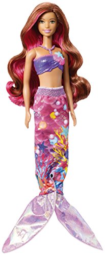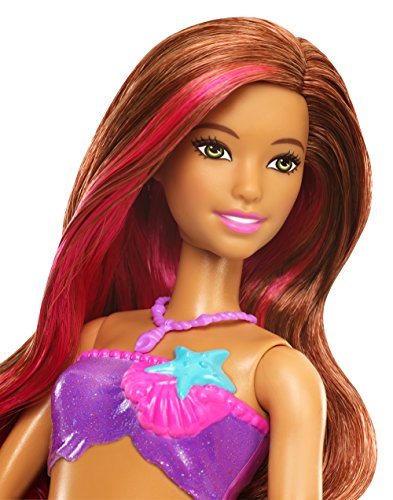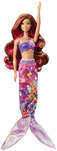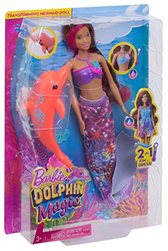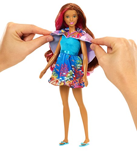 Bring Barbie doll's newest adventure to life with features and accessories that really make a splash! Ready to head into an ocean of fun, this Barbie co-star doll can transform her look from girl to mermaid to recreate the action from the story. Change her summery sundress into a mermaid look by pulling down the sleeves. Then transform her look again with color-change magic -- use warm water to change her bodice AND her tail from sparkling purple to blue. Spray her some more for water-play fun with her water-squirting dolphin. Additional accessories that expand play even more include a necklace, a pair of shoes and a hair comb for her pink-streaked hair. Colors and decorations may vary.Feature