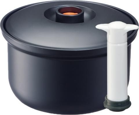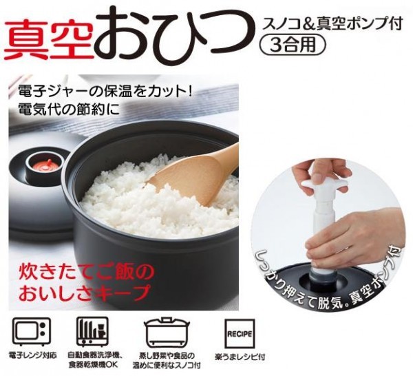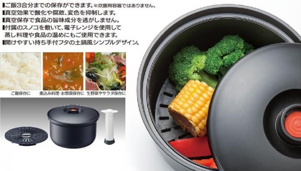 | 電子ジャーの保温をカットし、電気代の節約になります。真空保存で食品の旨味成分を逃がしません。付属のスノコを敷いて、電子レンジを使用して蒸し料理や食品の温めにもご使用できます。開けやすい持ち手付フタの土鍋風のシンプルなデザインです。 |