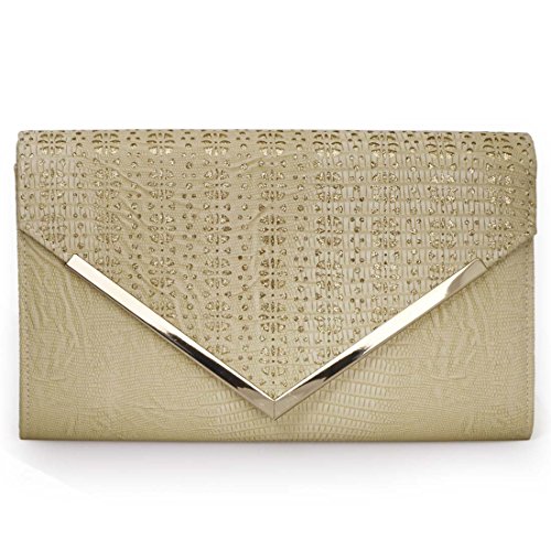 -. Brand : b.m.c -. Department : womens -. Feature : COMPACT, YET SPACIOUS this bag has the following dimensions 11.1 in (L) X 2.7 in (W) X 6.9 in (H) / ULTRA STYLISH EXTERIOR - perforated flap features glitter accents and an alloy metal edge piece / FLAWLESS INTERIOR - main compartment has soft lining and features 1 open side pocket / VERSATILE DESIGN - add or remove the additional shoulder chain for a 20 inch drop / OTHER DETAILS - Style: Envelope flap clutch. Closure: magnetic snap button. Max Opening: 5.5 inches -. Label : Bundle Monster -. Manufacturer : Bundle Monster -. NumberOfItems : 1 -. ProductGroup : Shoes -. ProductTypeName : HANDBAG -. Publisher : Bundle Monster -. Studio : Bundle Monster -. Title : BMC Womens PU Leather Alligator Skin Pattern Glitter Metal Accent Flap Clutch