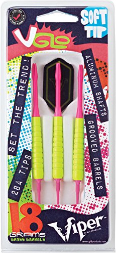 Studio : Viper Publisher : Viper Binding : Sports Product Description The Viper V Glo soft tip darts are designed with high quality, color coated brass barrels which offer exceptional balance and styling in a slim profile. Having a slim profile dart barrel is necessary to obtain a closer grouping of darts to maximizing scoring. Intended for use with electronic dartboards and are ideal for casual-to-intermediate level players. Each barrel has strategically placed knurled bands, deep grooves and rings that make excellent gripping points and encourages consistent hand placement. Viper V Glo darts are equipped with heavy-duty, lightweight aluminum shafts with locking holes that allow for a tighter fitting to the barrel, improving stability and greatly reducing the need to retighten during play. Quality flights help increase speed and reduce drag, producing a consistent flight path for pinpoint accuracy; detailed graphics are prominently displayed for added flare. These darts feature 2BA Tufflex Tips II soft tip dart points that have a reinforced cone, making them extremely strong and durable. Simply twist for a tight, secure fitting and easy removal. The barrels are compatible with all 2BA sized corkscrew thread dart points. 0