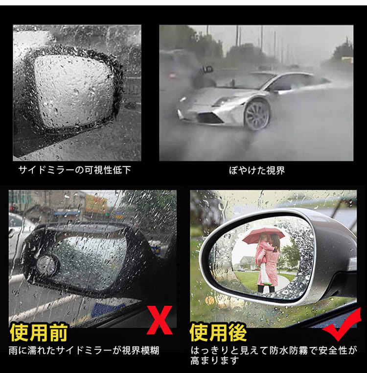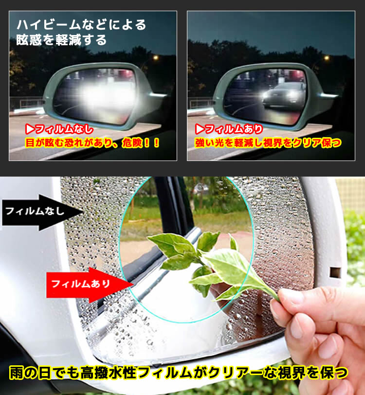 【安全性】本撥水フィルムをドアミラーに貼って、雨や雪でもサイドミラーがはっきり見え、視覚を確保します。