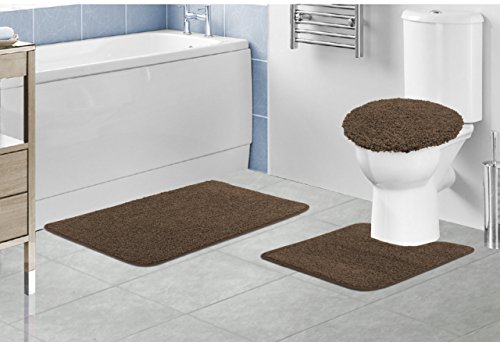 Bath Rug Set, Shaggy Style, 3 Piece Mats, Bath Rug (18"X30"), Contour Mat (18"x18"), Lid Cover (18"x18"), Le Benton - Brown