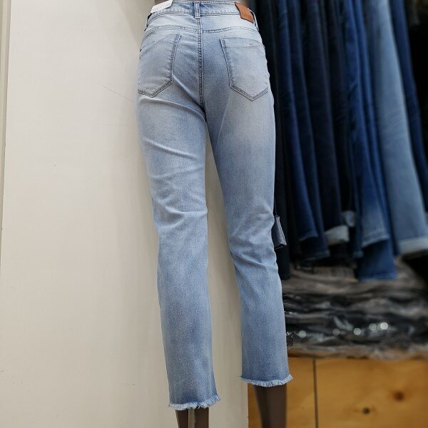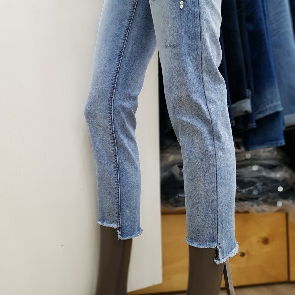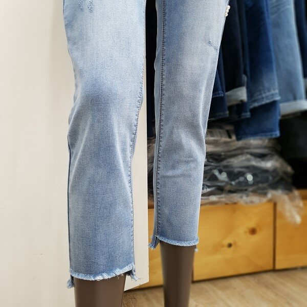 라이트한 인디고 컬러에 올브러쉬를 은은하게 주어 고급스러운 워싱감을 표현. 진주장식을 매치하여 여성스럽고 유니크한 제품입니다.