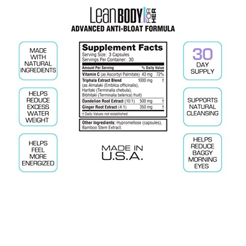 Jamie Eason's lean body for her advanced anti bloat formula is made from all natural ingredients. Triphala is one of the main ingredient blends in the anti bloat and is a mild detoxifying agent. It also contains dandelion and ginger root.Feature