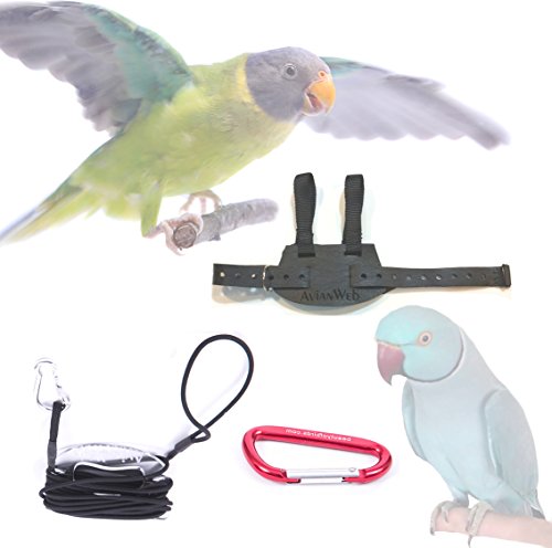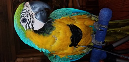 -. Feature : SIZING is easy! We size our harnesses by SPECIES. If a harness doesn't fit, we will send out a custom-sized harness specifically for your bird. If fitted properly and undamaged, this harness should be comfortable and ESCAPE PROOF / This item solved challenges of other harnesses: no more pulling wings through loops (which birds hate), easy and intuitive installation of the harness (without a steep learning curve). Note: birds still need to be slowly introduced and HARNESS TRAINED! Please follow instructions. The harness is fitted over the neck; the abdomen belt closes up on the back. A D-Ring (for the leash) automatically slides from the front to the back as a bird is moving around eliminating SUDDEN IMPACT / The heavy-duty faux leather vest is made out of PVC-free Polyurethane and a comfortable Cotton Fleece backing. Unlike nearly all faux leathers, this material breathes just like genuine leather; it feels like leather, and is easy to maintain (simply wipe to clean) / The light, yet strong elastic cord is resistant to abrasion, mildew & UV sunlight. The stretchy cord can stretch up to TWICE its length. A Frustration-free Leash Handle helps avoid entanglement of the bird leash / It is easy to drop the leash when you get startled, stumble or get pushed. Therefore, we include a carabiner so that you can attach the leash to your clothing (i.e., a belt) before clipping it onto your bird.