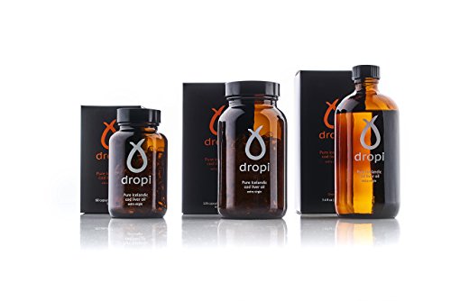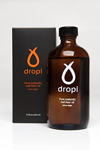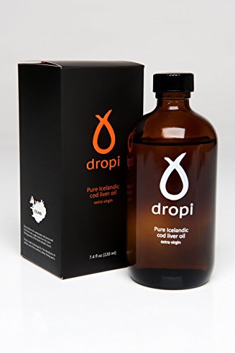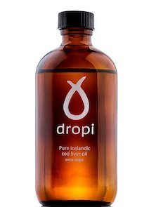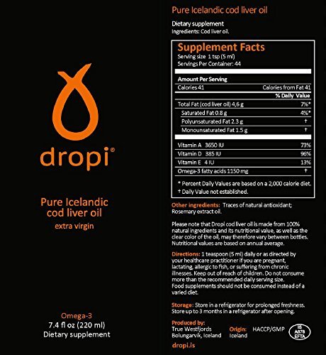 THE OIL Dropi's oil is a pure natural Cod liver oil. The texture has a clear yellow and reddish tone without any cloudy appearance at room temperature. When refrigerated, the oil may become cloudy and thicken, due to the presence of natural stearin. It is important to keep in mind, that Dropi cod liver oil is less processed than regular commercially produced cod liver or fish oil. It is cold processed and therefore classified as virgin oil. The vitamins A & D are in their natural state and may therefore vary between seasons. These vitamins are not added to our oil. Omega-3 and other fatty acids are as pure and natural as intended by nature. Small amounts of Rosemary combined with natural vitamin E are added to preserve this delicate oil. THE COD LIVER The fishermen bring in the fresh wild cod daily from the clean seas of the North-Atlantic Ocean just outside the Westfjords in northwest Iceland where it's processed immediately at our facility which is located by the harbor at Bolungarvik and few meters from the local fish market. THE BOTTLE Our bottles are made of dark brown glass to protect the oil from light. The cap has protective sealing to prevent leaks and spills. Short bottle neck and small opening to make pouring in teaspoon easy as possible. Nutritional facts: Cod liver oil Serving size 1 tsp (5ML) Servings Per Container: 44 Calories 41 Fat (fish oil) 4.6 g Of which Saturates 0.8g Monounsaturated fatty acids 1.5 g Polyunsaturated fatty acids 2.3 g Carbohydrates 0 g Of which Sugars 0 g Protein 0 g Salt 0 g Vitamin A 3650 IU Vitamin D 385 IU Vitamin E 4 IU Total Omega-3 fatty acids 1150 mg EPA (Eicosapentaenoic acid) 350 mg DHA (Docosahexaenoic acid) 450 mg Other Omega-3 acids 350 mg Other ingredients: Traces of natural antioxidant rosemary extract oil and natural vitamin E. Please note all Dropi products use Nitrogen to reduce oxidization of the product.