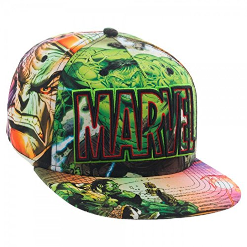Marvel Comics Text Logo Sublimated Snapback Hat. Cap Design features sublimation pattern featuring the Incredible Hult, The Punisher, Iron Patriot, The Avengers & many more printed all over.