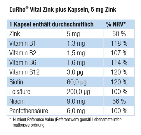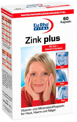 -. Feature : EuRho Vital Zink plus Kapseln enthalten eine ausgewogene Kombination aus Zink, Vitamin C und den Vitaminen des B-Komplexes. / Zink, Biotin, Niacin, Vitamin B2 und Vitamin C tragen zum Erhalt normaler Haut bei. Biotin und Zink tragen zum Erhalt normaler Haare bei; zudem trägt Zink zum Erhalt normaler Nägel bei. / Folsäure, Vitamin B12 und Zink tragen zu normaler Zellteilung bei und Vitamin C, Vitamin B2 und Zink unterstützen den Körper beim Schutz der Zellbestandteile vor oxidativen Schäden. / Inhalt: 60 Kapseln