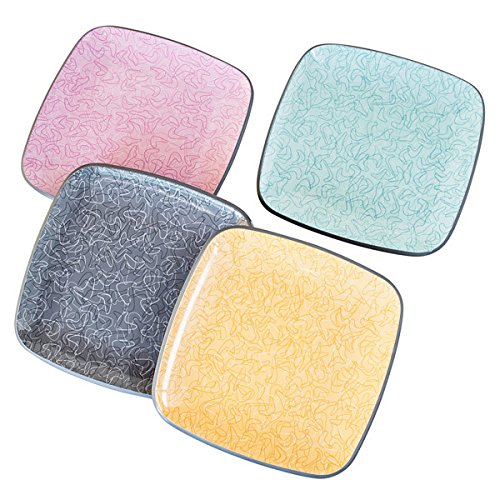 -. Feature : 50's retro boomerang graphic in durable, heavyweight melamine / Set of 4 in yellow, grey, green and pink / Contrasting matte grey undersides / 8.75 inches square; dishwasher-safe, no microwave or oven