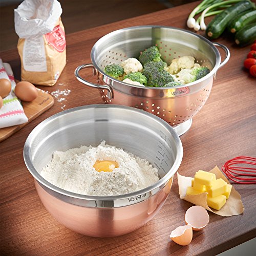 VonShef Premium 2pc Copper Stainless Steel 9.5 inch Colander and 10.2 inch Mixing Bowl Set
