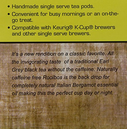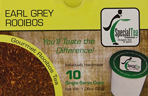 -. Binding : Grocery -. Brand : Special Tea -. EAN : 0687847813613 -. Feature : Handmade single serve tea pods / Convenient for busy mornings or an on-the-go treat / Compatible with Keurig K-cup brewers and other single serve brewers, not compatible with Keurig vue or rivo / Caffeine free / Brew two cups from a single cup -. Label : Special Tea -. Manufacturer : Special Tea -. MPN : 687847813613 -. NumberOfItems : 1 -. PackageQuantity : 1 -. PartNumber : 687847813613 -. ProductGroup : Grocery -. ProductTypeName : GROCERY -. PublicationDate : 2015-01-31 -. Publisher : Special Tea -. ReleaseDate : 2015-01-31 -. Studio : Special Tea -. Title : Special Tea Single Serve Cup Earl Grey Rooibos Tea, 10 Count -. UPC : 687847813613