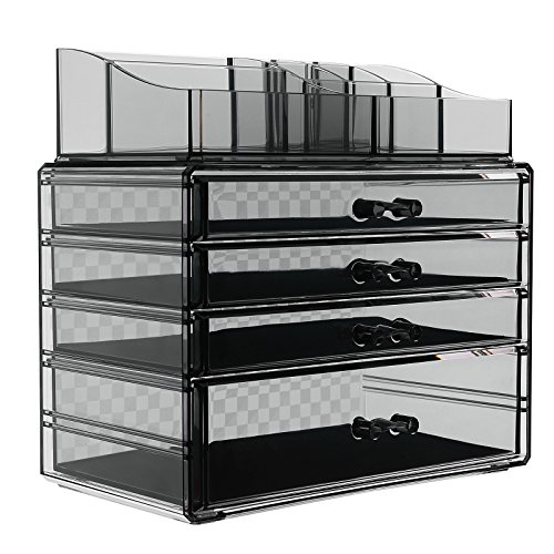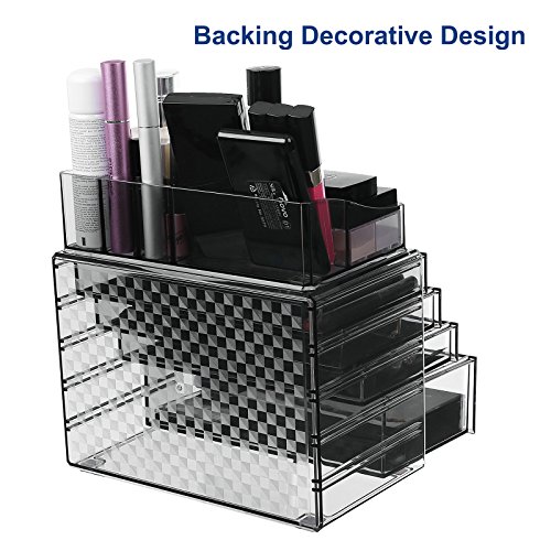 - UNIQUE MAKEUP ORGANIZER: Smoky gray color matches any decor, translucent feature makes it easy to find what you want, simplify your makeup routine, checkered design on back adds extra sleek look