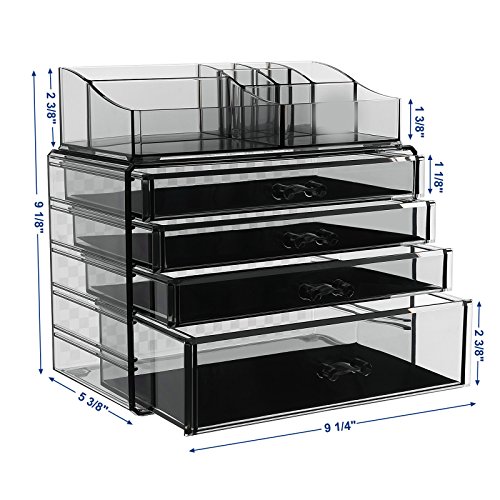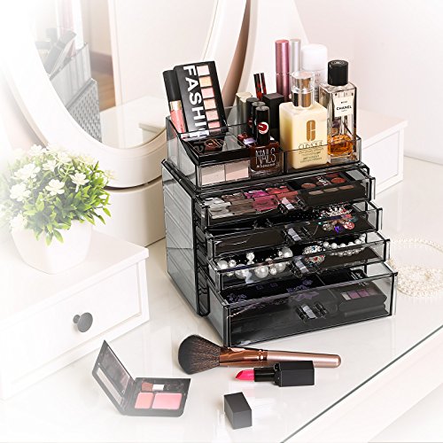 - ROOMY DRAWERS: Easy to fit large palettes in bottom deep drawer; Jewelry and foundations in other 3 roomy drawers; brushes, lipsticks and mascaras in upper 8 compartments, organize all cosmetics in one place