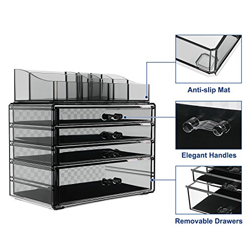 SONGMICS 4 Drawers Makeup Organizer 2 Pieces Set Cosmetic Storage Display with 8 Top Compartments Checkered Design Back Smoky Gray UJMU18T