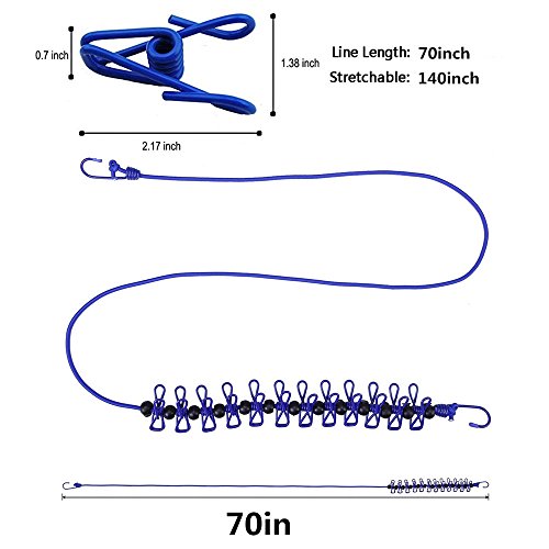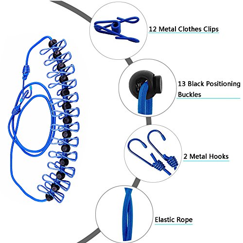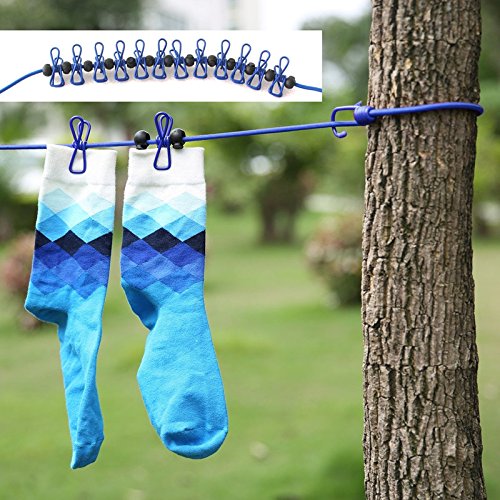 Portable Clothesline,Carly Shop Windproof Elastic and Adjustable Clothesline with 12 Clips for Outdoor Indoor Travel Camping(Blue)