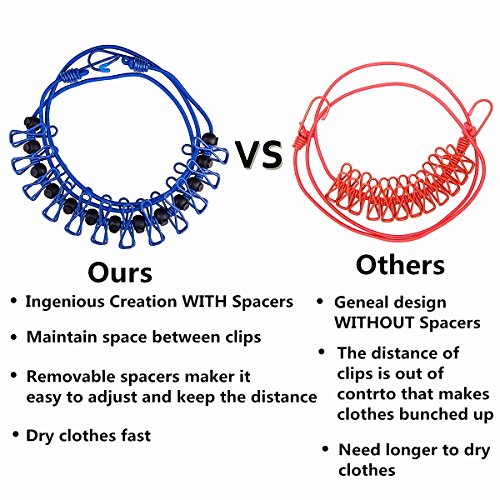 ☀ANTI-SLIP DESIGN - The 12 Clips are separated by 13 Black Rubber Beads (which can slide along the cords) that prevents items from bunching together due to weight or wind and improves drying effect.