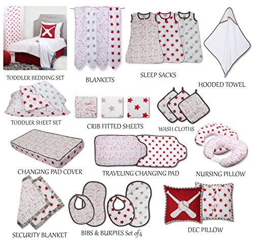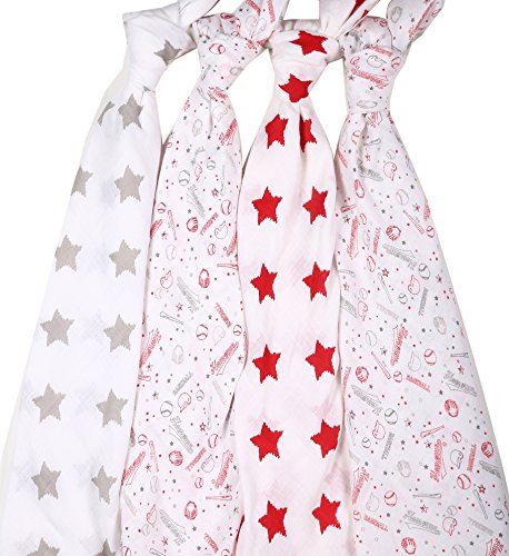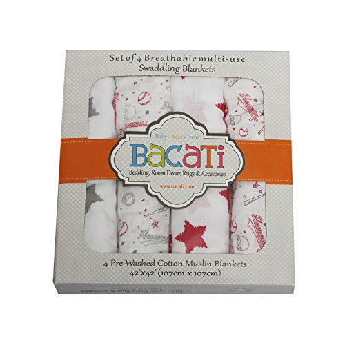 -. Title : Bacati Baseball Set of 4 Muslin Swaddling Blankets, Red/Grey