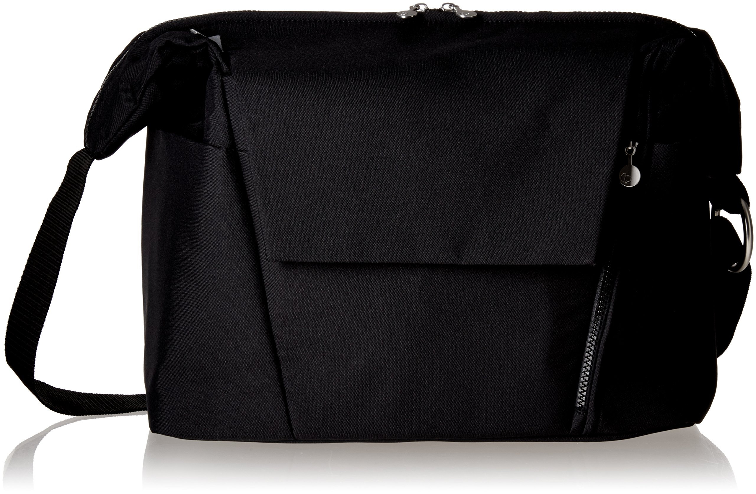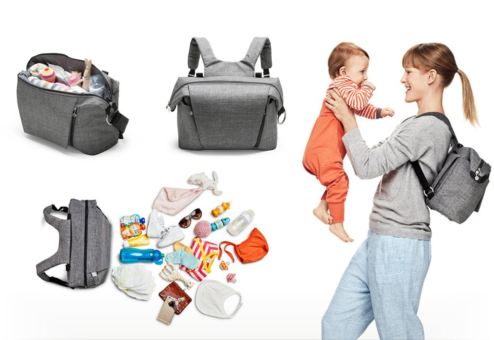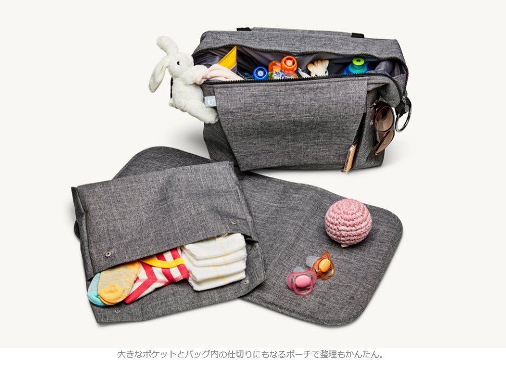 A mat for changing diapers is stored between the body and the bag, and it also serves as a pad.