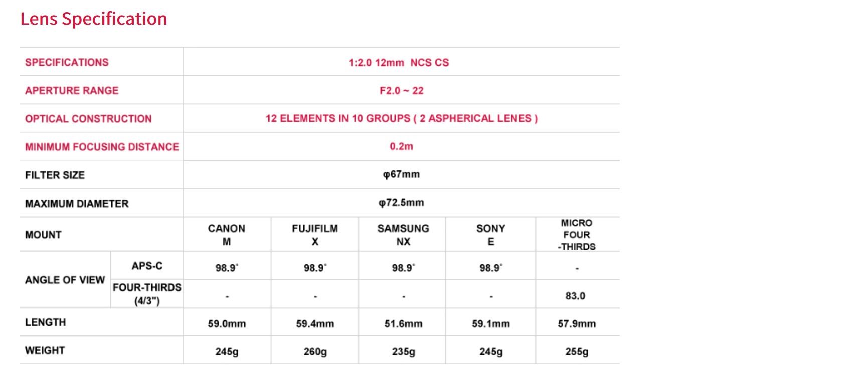 12 mm F 2.0 NCS CS is a super wide angle manual focus lens for mirrorless designed for APS - C crop sensor.
