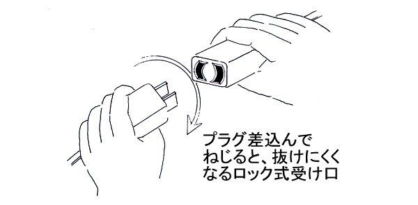 ●プラグを差し込んでねじると、ロック機構により抜けにくくなります。※必ずプラグはきっちり差し込んで右に回してロック機構が働いたのを確認してご使用下さい。ロックしない状況でのご使用は、加熱、発火の原因となり危険です。