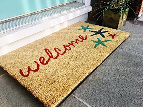 Keep the sand on the beach and off your floors with this seaside doormat. Thickly woven with natural fiber from sustainably harvested coconuts, our coir doormat is perfect for entry ways, garages, patios, porches and any high traffic areas inside or outside your home. This eco-friendly and durable rug easily absorbs moisture, resists mildew and most stains, and welcomes guests with style. This all weather welcome mat can be used indoors or outdoors to stop mud, rain, snow, dirt and debris in their tracks. The best part? Easy clean up. To clean, just shake the mat off.Feature