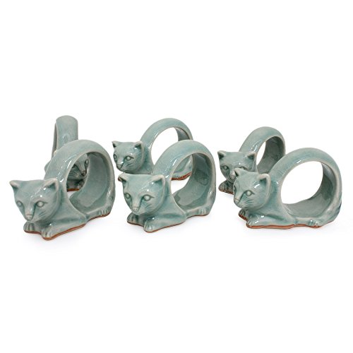 NOVICA "Siamese Cat" Celadon Ceramic Napkin Rings, Set of 6