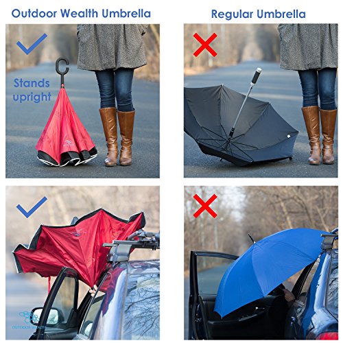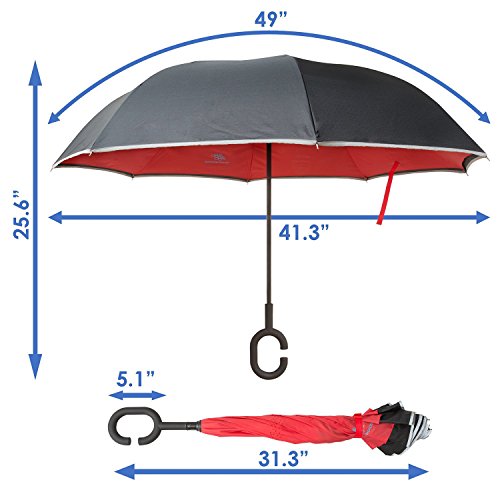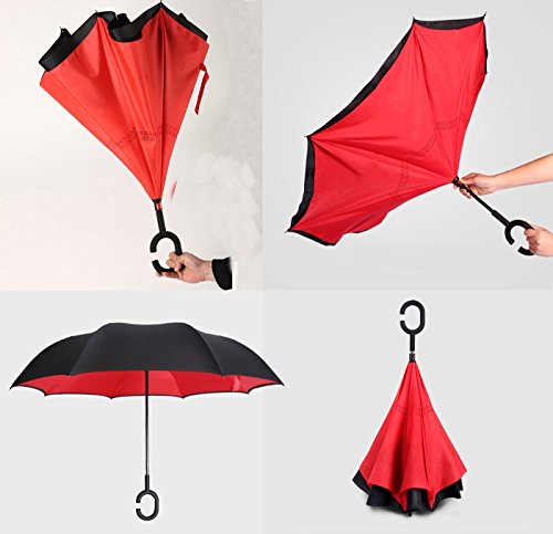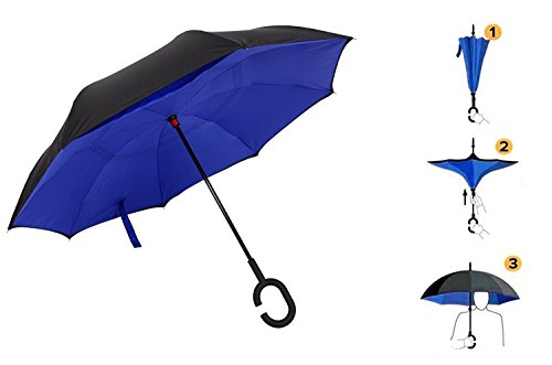 -. Feature : ☂8 FIDER UMBRELLA RIDS:Our inverted umbrella have fibrous ribs are stronger and will not be damaged by a strong wind.Use longer times / ☂MULTIPURPOSE:Reverse Folding Umbrella Windproof waterproof UV Protection,Apply not only in rainy days, but also in sunny days / ☂C-SHAPE-HANDLE:The C-shaped hand grip allows you to play with mobile phones when you hold the reverse/inverted umbrella with your wrist and lift a bag in the rain, also convenient for mothers to hold the umbrella when they have a baby in arms. / ☂DOUBLE LAYER PROTECTION:Made of water repellent pongee fabric,breathable double layer canopy and smooth top,using high-quality electroplated steel shaft and premium resin-reinforced fiberglass ribs.We will also send you an umbrella cover for Free Gift / ☂ INSIDE-OUT FOLDING:Innovative design allows you to close it in an inverted & reverse direction, which means the outside layer will become the inside layer after closing.so you can put it directly anywhere in a car or a room without making the seat or floor wet, and even other people standing beside you on a bus or the subway will not get wet, either.