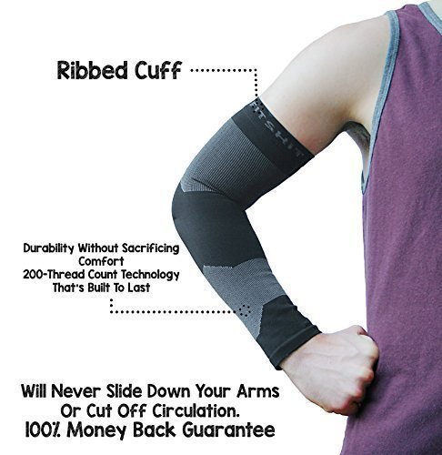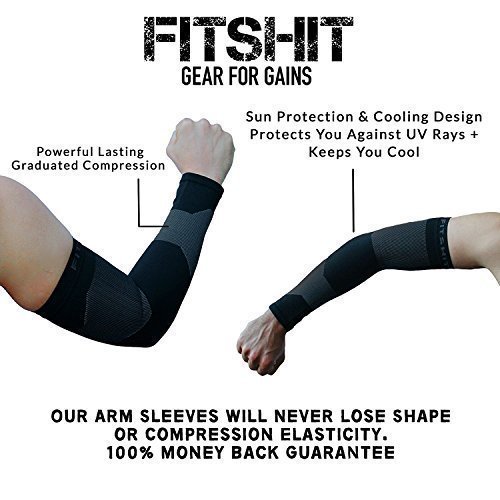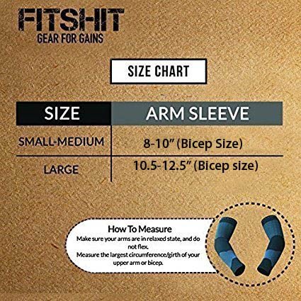 -. Feature : PREMIUM COMPRESSION TECHNOLOGY Arm Sleeves offer the highest quality materials designed to significantly increase blood flow, reduce pain & minimize injuries, so you can get back to your favorite activities faster. (Sm/Med 8-10" Biceps, Large: 10.5 - 12.5" Biceps) / NO MORE ARM PAIN - Proven to support arm stiffness, soreness, circulation, bursitis, arthritis, osteoporosis, tendonitis, chafing, skin irritation, cover tattoos and optimal recovery for runners, athletes, fishing, jogging, climbing, walking, travel, & gym training. Many of our customers are office workers, athletes, runners, tattoo artists, doctors, nurses and travelers. / EASY TO WEAR + STAY COOL & DRY. Our moisture wicking design and soft unisex elastic brace offers maximum comfort and mobility while keeping you cool and dry so you can wear them all day, even to sleep. / UV SPF 50+ Sun Protection Technology blocks 99.8% of harmful rays so you can enjoy all of your daily outdoor sports and hobbies. / 100% MONEY BACK GUARANTEE. We use extremely durable and anti-itch fabric so you don't have to worry about them falling apart after a wash, unraveling, or being too tight.