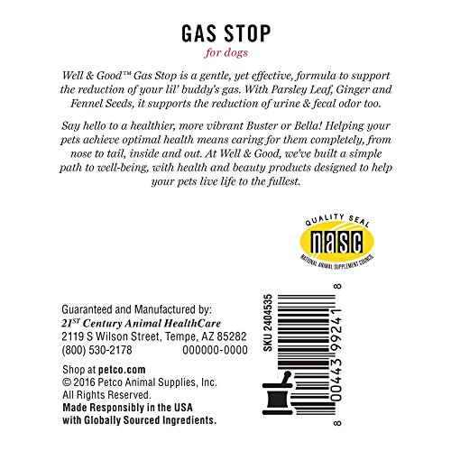 -. Binding : Misc. -. Brand : Well & Good -. EAN : 0800443992418 -. Feature : Helps balance your dog's digestive system / Reduces urine and feces odors / For dog use only / Made in the USA -. Label : Well & Good -. Manufacturer : Well & Good -. MPN : 44399241 -. PackageQuantity : 1 -. PartNumber : 44399241 -. ProductGroup : Pet Products -. ProductTypeName : PET_SUPPLIES -. Publisher : Well & Good -. Studio : Well & Good -. Title : Well & Good Gas Stop Dog Tablets, 60 count -. UPC : 800443992418