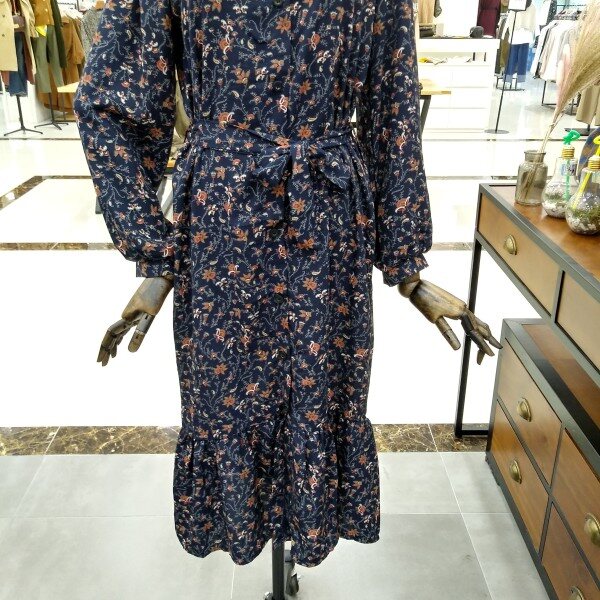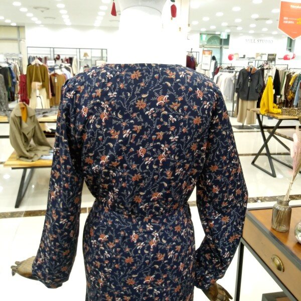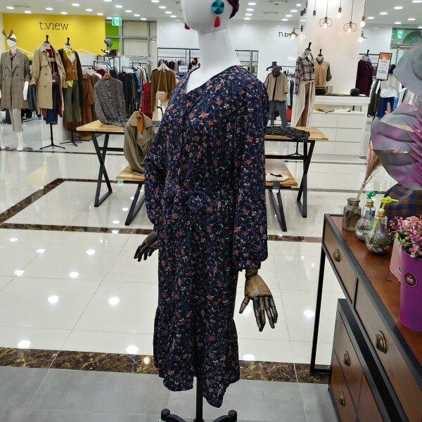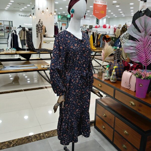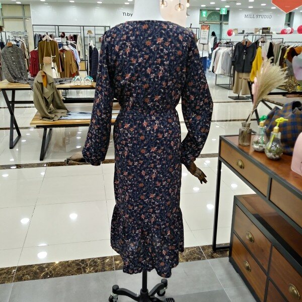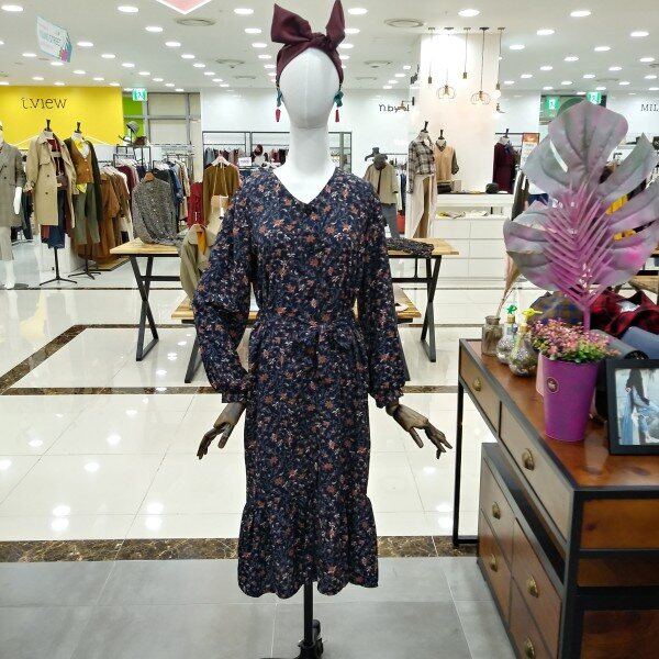 밑단프릴로 여성스러우면서 허리끈으로 라인잡아줘서 날씬핏연출로 이쁘게 입기좋은 프린팅 원피스이에요