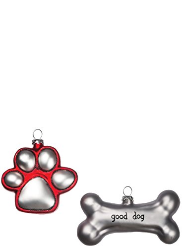 Dog Paw and Bone Silver Red 3 inch Glass Christmas Ornaments, Set of 2