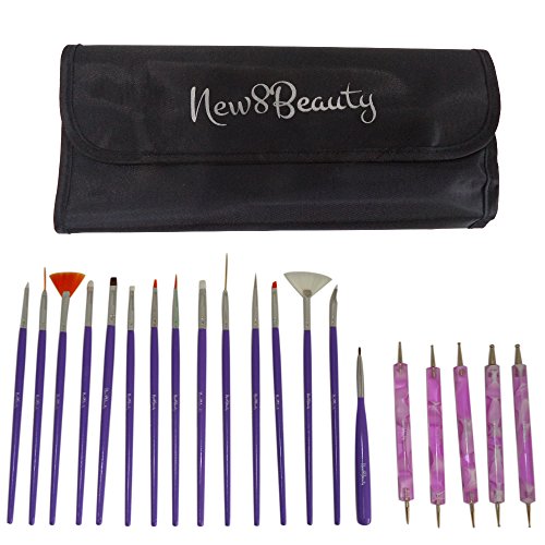 Valentines day gifts Mother Day gifts Stocking Stuffers FINE DETAILING NAIL ART & FACE PAINTING BRUSHES SET - CONTAIN EVERY BRUSHES TOOL SUPPLIES YOU NEED FOR PERFECT NAIL ART: In New8Beauty Nail Art Brush Tools Set, there are 20 pcs: 2 Flat Fan Brushes; 1 Angled Head Brush; 1 Pattern Brush; 2 Liner Brushes; 3 Flat Brushes; 3 Oblique Brushes; 1 Dotting Pen Brush; 1 Drawing Brush; 1 Petal Brush; and 5 Dotting Pens.