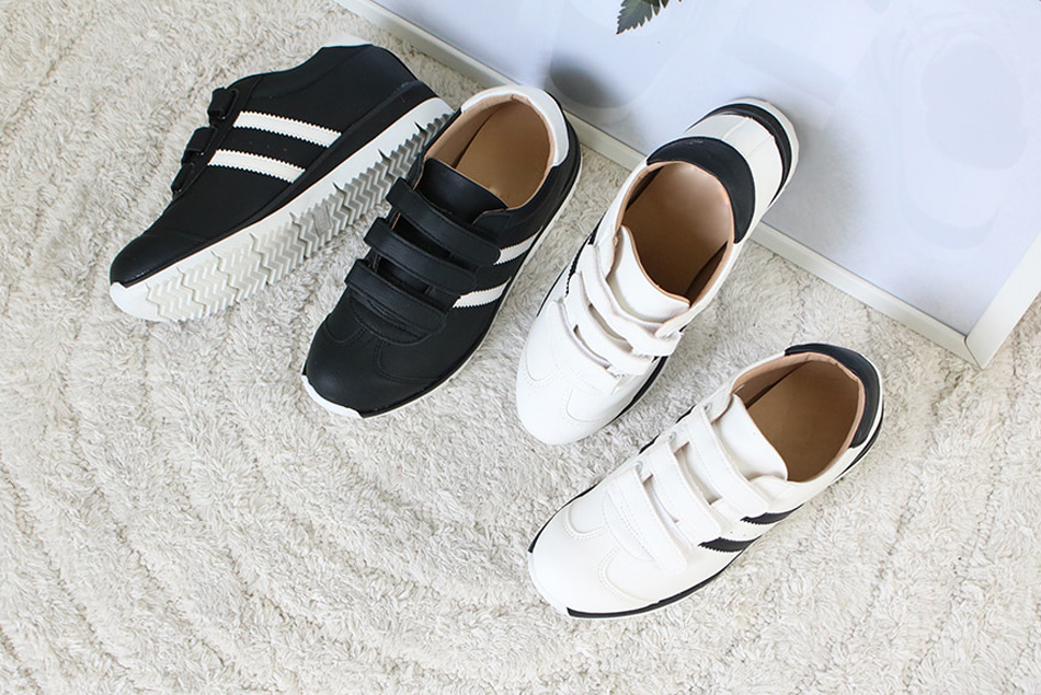 국내 제작 벨크로 스니커즈 입니다 둥글린 라운드 토우로 발끝까지 가지런히 모아주어 착화했을때의 라인이 깔끔하게 보여지구요 고급스러운 인조가죽 소재로 제작되어 고급스러우면서도 캐주얼한 매력이 있는 슈즈랍니다 발등위 3줄의 벨크로 (찍찍이) 스트랩으로 핏감 조절이 가능하여 발에 맞게 조절하여 신으실수 있습니다 발을 전체적으로 감싸주는 디자인으로 들뜸없이 헐떡임없이 편안하게 착화하실수 있스빈다 3cm의 굽높이로 착화감이 안정적이며 부담없이 즐겨 신기 좋구요 폭신한 쿠션패드가 있어 충격을 흡수해 발의 무리를 덜어주어 편하게 신으실수 있습니다 캐주얼한 디장니으로 어떠한 룩에도 자연스럽게 잘 어울리며 다양한 스타일에 매치하여 데일리 슈즈로 신기 좋은 슈즈입니다 활용도 만점의 데일리아이템 소개합니다.