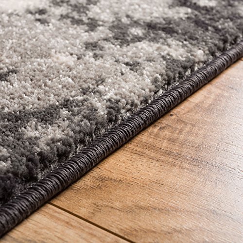 Longlac Grey is a modern style with a perfectly subdued aesthetic. This heavily distressed, abstract pattern has warm, calm colors of charcoal, light grey, and ivory. A plush 0.5" pile of air twist frieze polypropylene gives an exceptional textured look. The yarn is soft, stain resistant, and doesn't shed or fade over time. A 100% jute backing is safe for wood floors and all four sides of the rug are serged for improved durability.Feature