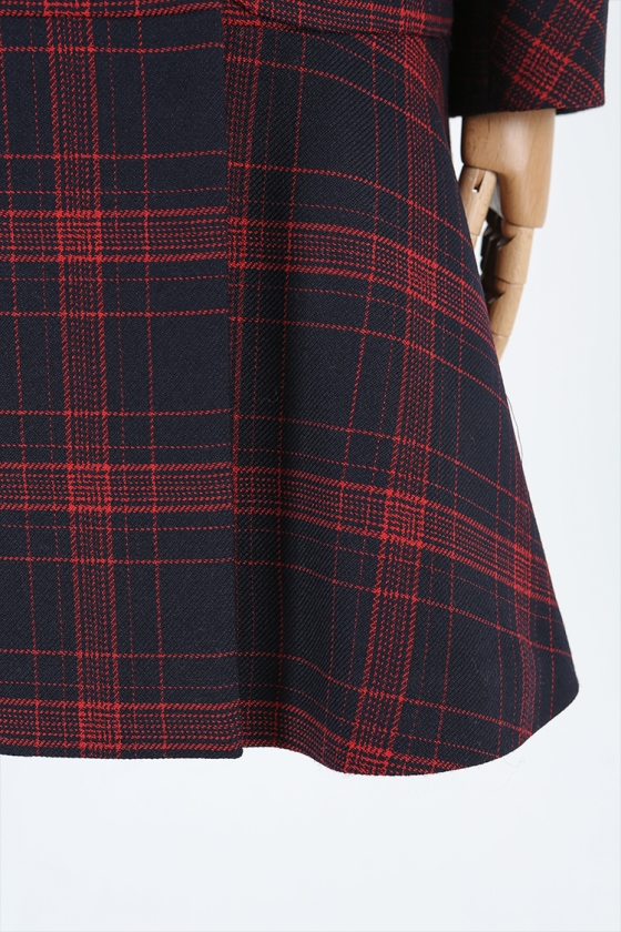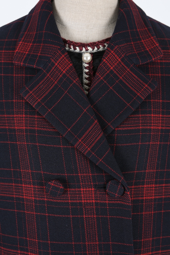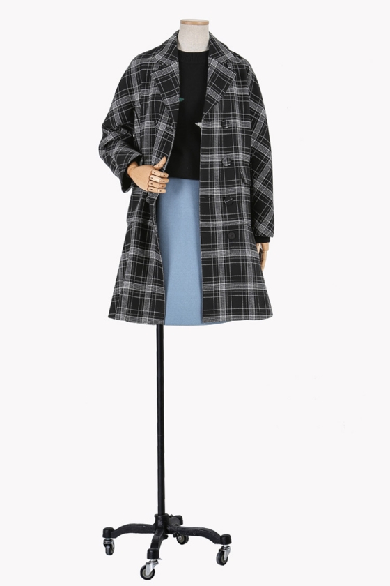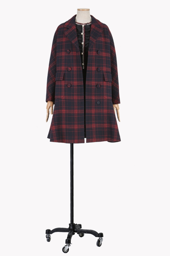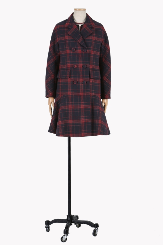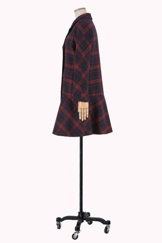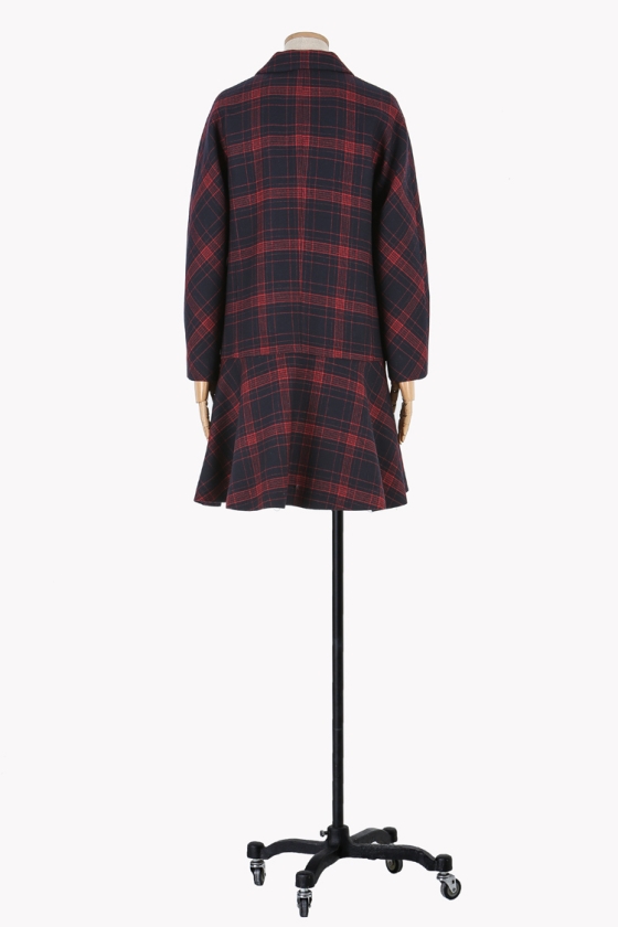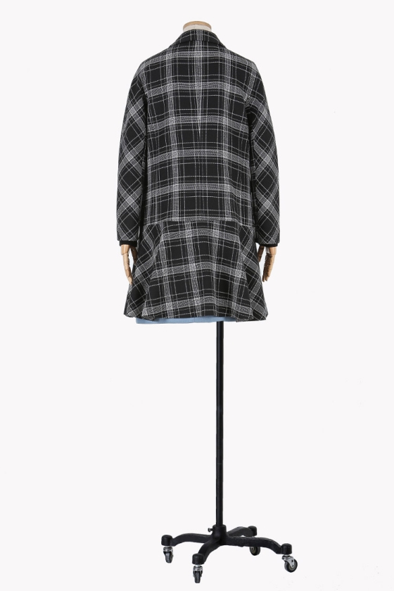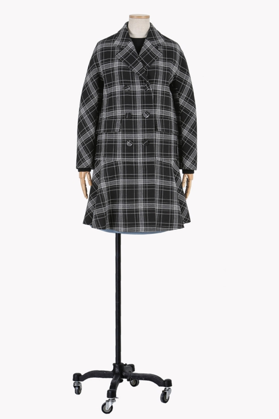 밑단의 플레어 라인이 여성스러운 체크 코트입니다.제천 싸개단추로 포인트를 주었으며, 양쪽에 주머니가 있어 실용적입니다. 여유있는 H라인 실루엣으로 제작하여 두께감 있는 이너를 착용하기에도 편안한 스타일입니다.
