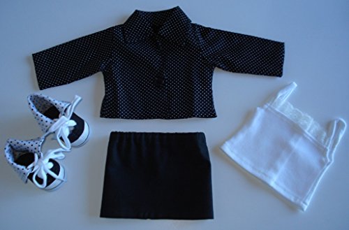 Studio : Doll Clothes Shop Publisher : Doll Clothes Shop Binding : Toy Product Description Black White 4 pc Skirt Outfit includes a black with white dots Jacket with front button closure, white Tank Top with back snap closure, a black Mini Skirt with easy on elastic waist and Hi-Top black Sneakers with contrasting white with black dots trim. 0