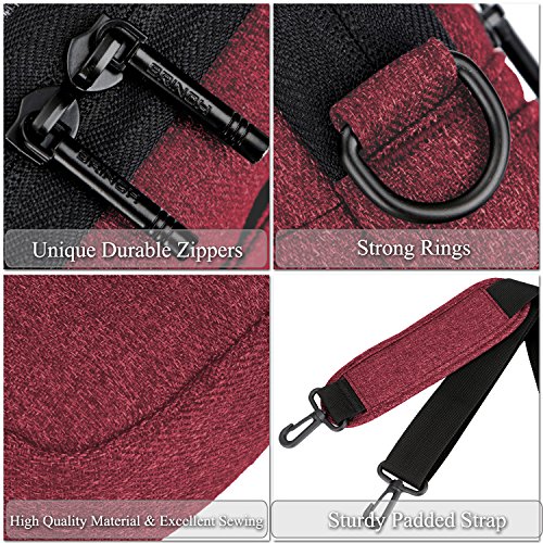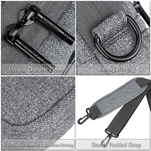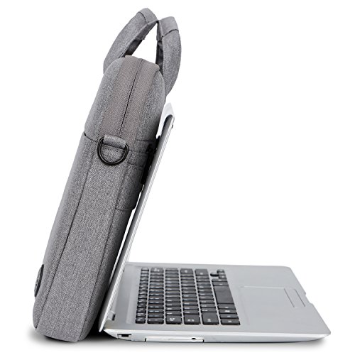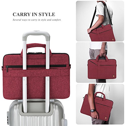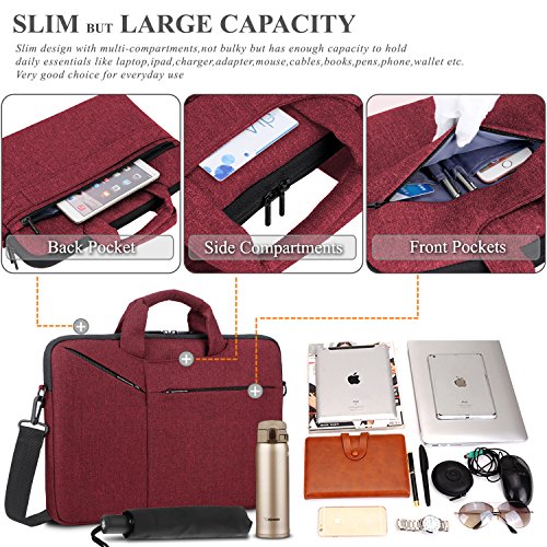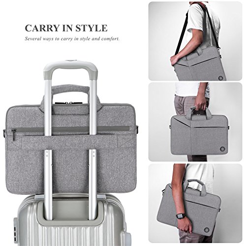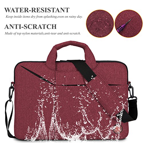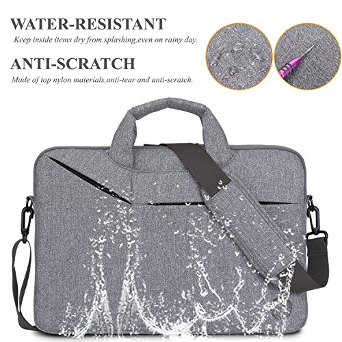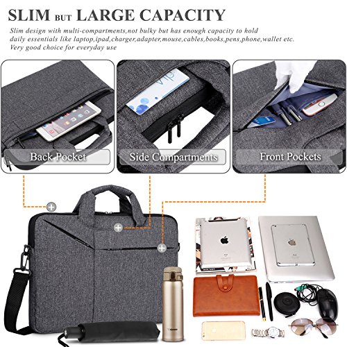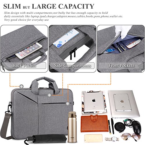 Creative Design -Slim but Multi-compartment Design,not bulky but has enough capacity to hold daily essentials. -Hidden-type Handles,easily hidden in compartments,making this bag to be a laptop sleeve. -Soft thick padding with fluffy lining to protect laptop much better. -Luggage Strap firmly fixed over trolley suitcase on travel. -Mutiple Carrying Ways,carry it On hand by handles,On shoulder / crossbody by shoulder strap or over trolley suitcase with luggage strap. -Well Water-resistant,keeps inside items dry on rainy day. -Anti-tear, Very lightweight Duarable.