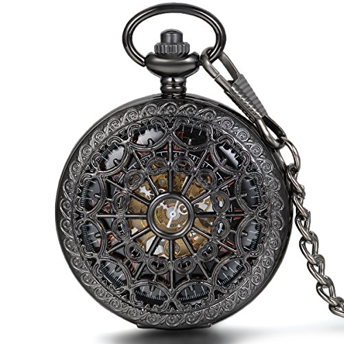 -. Title : JewelryWe Classic Hand-wind Mechanical Pocket Watch Skeleton Black Hollow Spider Web Case with Chain Belt