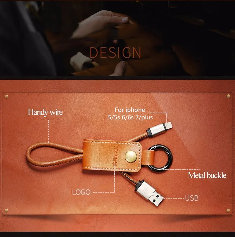 Features: Latest REMAX portable for Apple USB charging cable; round metal buckle + Genuine Leather keychain design; 3.0A high current output, rapid charging.