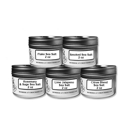 -. Feature : All natural. Never any MSG or fillers. Our spices are 100% pure. / Set contains: Flake Sea Salt, Smoked Sea Salt, Rosemary & Sage Sea Salt, Lime Jalapeno Sea Salt and Citrus Blend Sea Salt. / Our manufacturer custom packs all orders by hand so you know your spice is fresh. / A perfect way to sample Chef Cherie's diverse salt offerings! / Comes in convenient 2 oz. tins for easy use and storage.