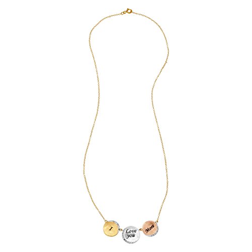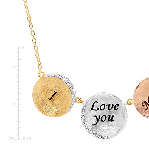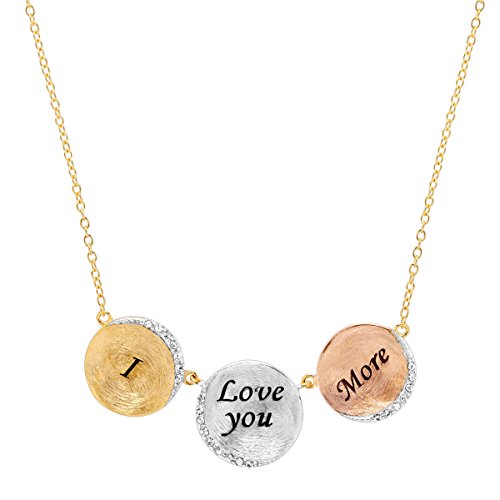 Show her your true colors with this meaningful necklace! Three discs, crafted in 18K gold-plated sterling silver, are engraved with the phrase 'I Love You More' and are accented with round-cut white Swarovski crystals. Feature piece measures 1/2 by 1 3/4 inches with a total length of 18 inches.Feature