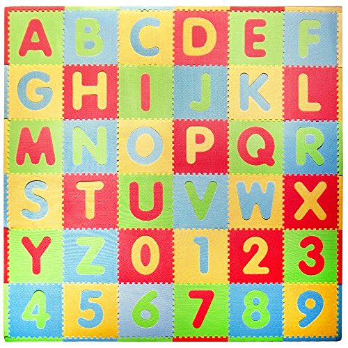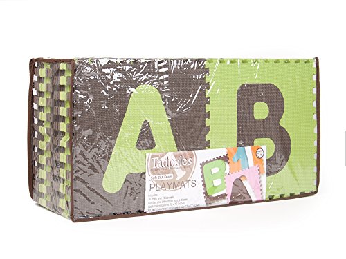 Using soft playful foam, Tadpoles ABC Floor Mats provide a fun, safe environment for your little one. Made of large interlocking foam puzzle pieces with removable letters and numbers, the mats create a soft base for the baby, and a great look for the room. Includes 36 Foam pieces with removable letters and numbers and 24 border pieces. Covers 36 square feet.Feature